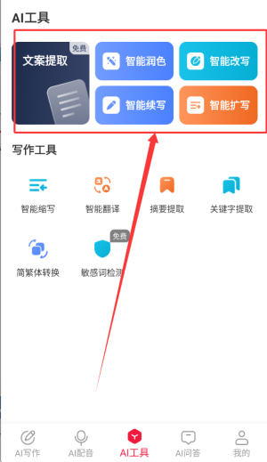3、AI工具板块包含文案提取、文本润色、内容续写、智能改写及扩写等多种编辑服务。