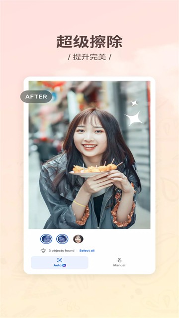 1、 对象移除:圈选照片中不需要的物体,软件自动分析周围纹理进行无痕填充,路人或杂物瞬间消失。