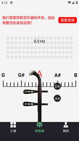 1、点击【我要使用】,授予录音权限,即可【借助界面元素进行乐器调音】。