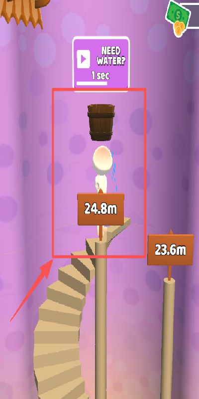 3、观小人缺水页,点左下角红色箭头所指的螺旋楼梯,让头顶水桶的小人继续爬楼找水。