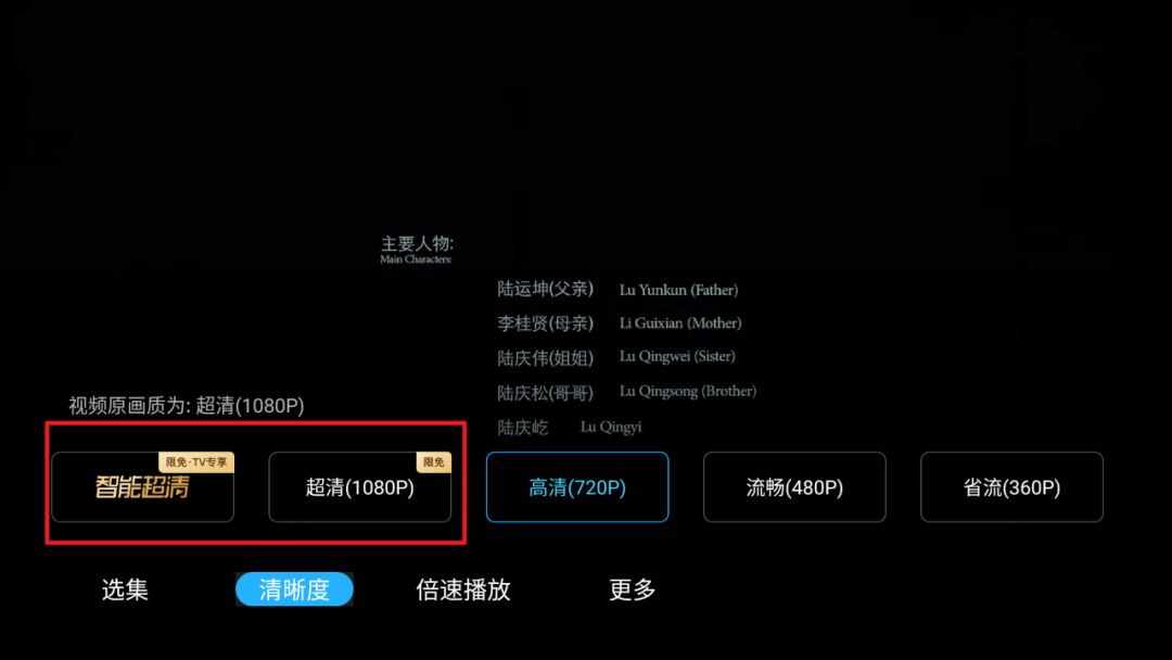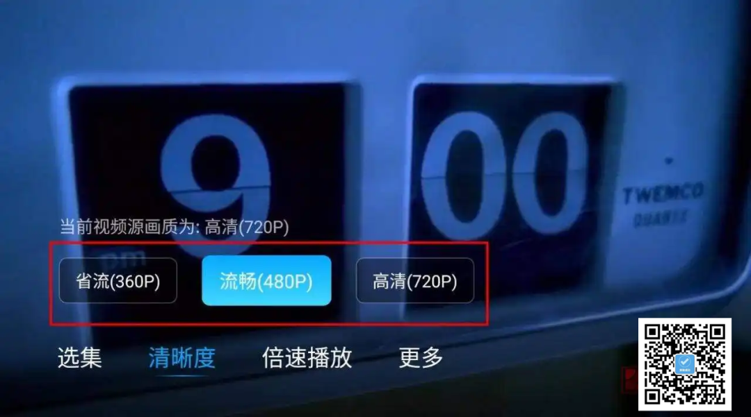 选集方面,可以自动切换影片的上下集,不需要再退出播放界面重新选集。清晰度上,可根据视频所支持的画质分辨率来进行选择,最低可选择省流量模式,分辨率为360P。
