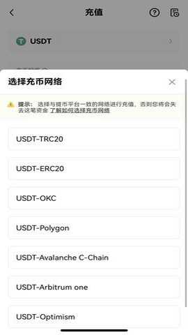 注意:选择充值网络时,其他交易所、钱包的提币/提现网络必须与易欧钱包充值的网络保持一致。例如,如果你选择了USDT-ERC20作为充值网络,那么提币/提现网络就必须选择USDT-ERC20,否则将会导致币丢失。