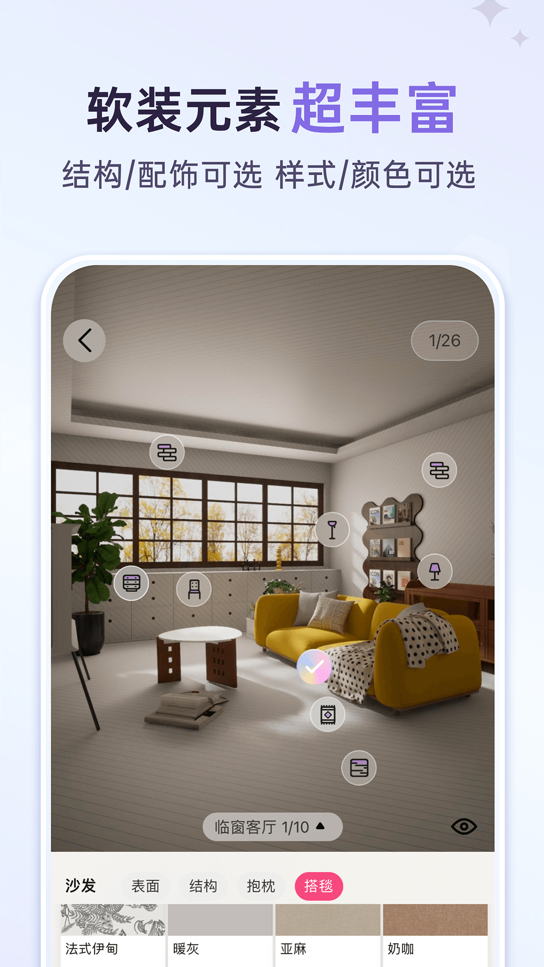来绘的搭配元素非常多,例如不仅可以选择不同种类的沙发,也能对选中沙发的表面、结构等部位的材质进行多样化的选择,个性化程度非常的高,一千个人眼中可能有一千种沙发样式,欢迎大家多多尝试!