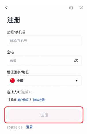 2、步骤二:根据提示填写信息(邮箱/手机号、密码、居住国家/地区等,邀请人ID选填),勾选“接受用户协议和隐私政策”后点击“注册”。