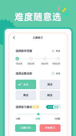 2、除了口算练习外,包含了多种练习模式,让用户可以根据自己的喜好选择不同的挑战。