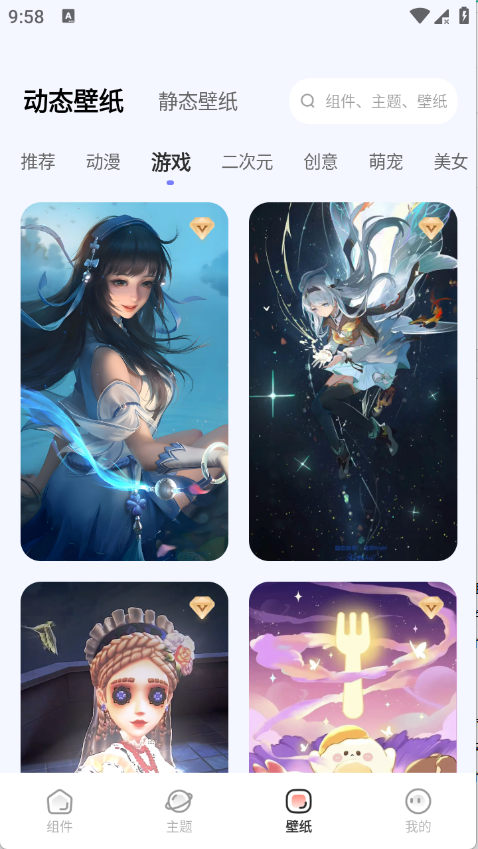2、点击壁纸页面,可看到多种类型壁纸,涵盖动漫、游戏、创意等多种风格,选择丰富。