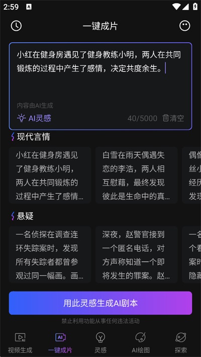 2、智能一体化生成:自动完成画面、配乐、字幕、特效的融合,无需手动拼接,成片效果完整。
