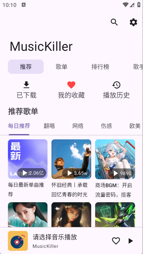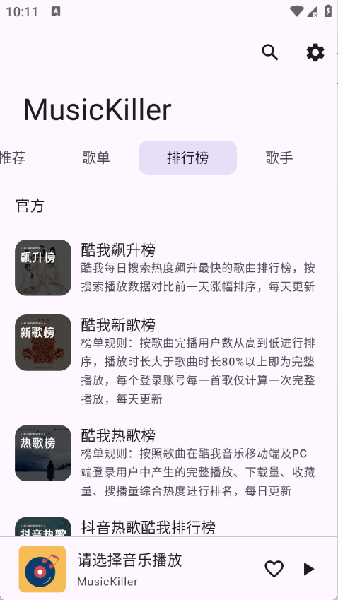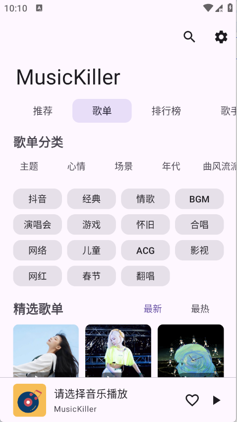 MusicKiller是一款音乐播放软件,这里有海量的音乐资源,所有歌曲都能免费收听,不用花钱就能一直听。你可以自己建立歌单,把爱听的歌放进去,点开就能直接播放。系统会根据你平时的听歌习惯,推荐风格相近的歌曲,基本上想找的歌都能搜到。这里有多种音效可以切换,能按照歌手、歌单或歌曲名字来查找音乐,里面收录了大量正版歌曲,不用开通会员,打开就能随时听,让你拥有属于自己的舒服听歌方式。