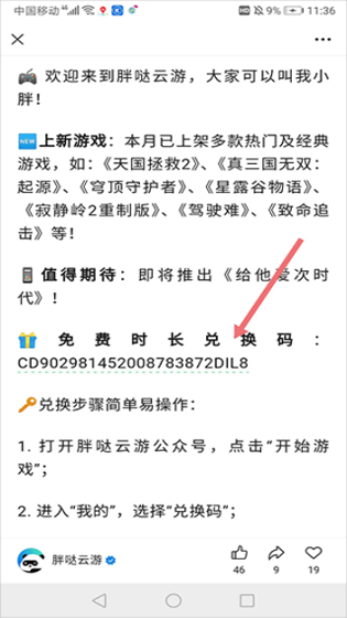 1、用户若想获取免费时长,需关注胖哒云游官方公众号,在公众号内查看福利日报。