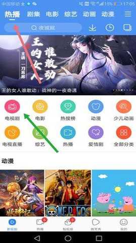 1、打开特狗影视,进入【影视剧】页面中的【热播】分页中(在顶部分页导航栏中可以判别,下图红色箭头所指区域)点击【电视剧】(下图绿色箭头所指区域)。