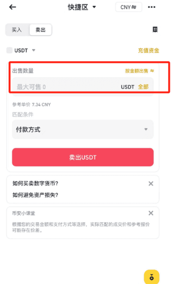 以USDT为例:打开币安APP首页,点击【快捷买币】―【去卖币】―输入【卖出数量】或【金额】―【出售USDT】―【确定】―选择收款方式,【确认出售】