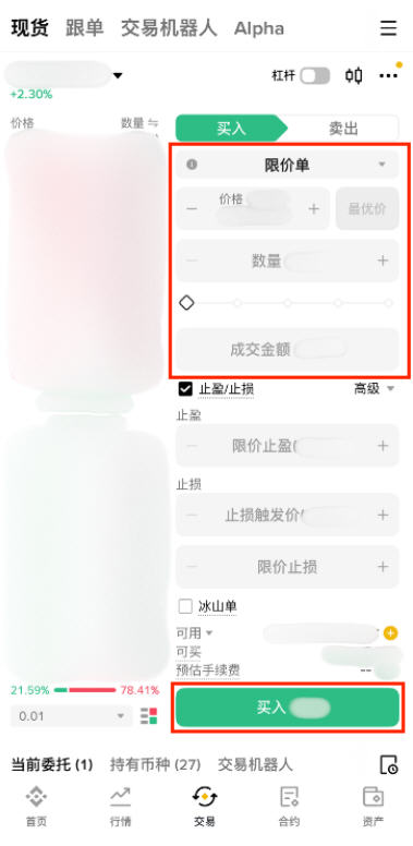 1. 登录币安App,前往【交易】 - 【现货】进入交易页面界面。
