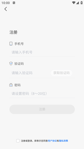 3.在注册界面输入手机号,验证码,密码,点击注册。