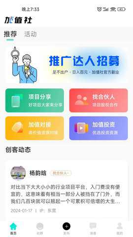 加值社是一款致力于连接创业者、项目方和投资者等资源的兴趣社区应用。用户可以在应用内加入各种社群,与志同道合的人交流分享想法和经验。用户也可以发布动态,展示自己的创业成果和想法,吸引更多关注和支持。