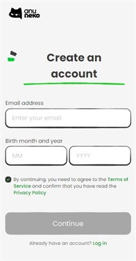2、填写电子邮箱与出生年月,勾选相关协议后,点击Continue按钮继续操作。
