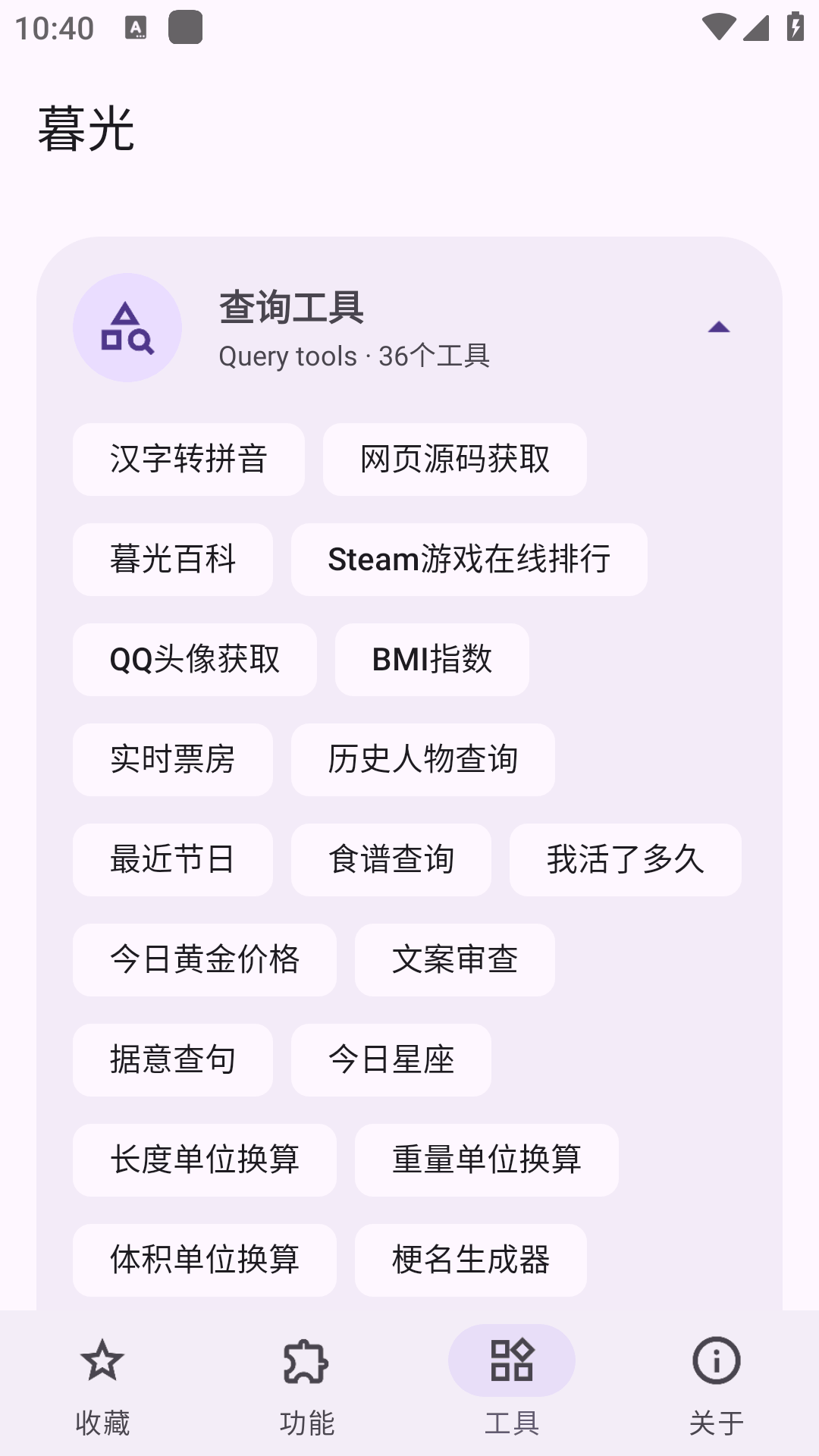 暮光工具箱app是一款手机多功能工具箱软件,软件中有着海量的实用功能等你体验,用户可以输入关键词进行快捷查询体验,满足不同用户的多样化需求,使用起来非常方便!对软件感兴趣的话不妨点击下载试试吧!