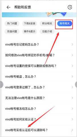 4、进入帮助和反馈点击【账户相关】点击【实名认证清除问题】;