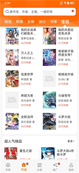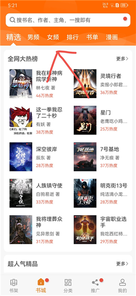 1、在首页中,我们可以看到精选、男频、女频、排行、书单、漫画等。