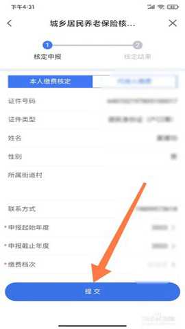 第三步:输入并核对个人信息,选择缴费档次,然后点击提交按钮,等待核定结果出来以后就可以进行缴费了。