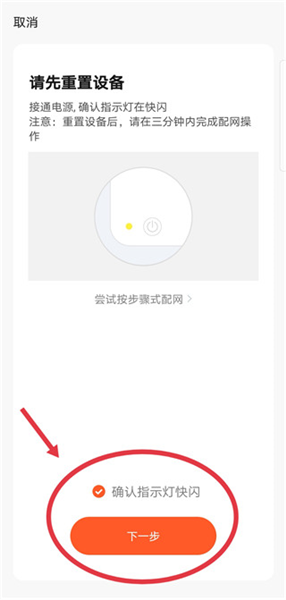 2、勾选确认指示灯快闪,点击下一步