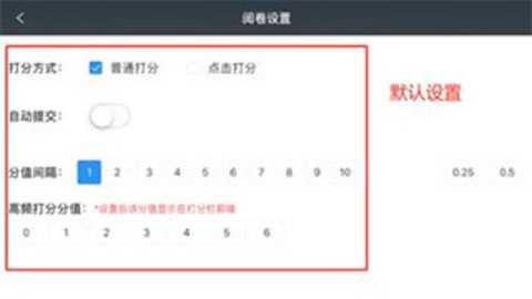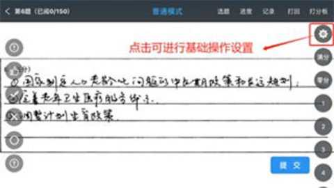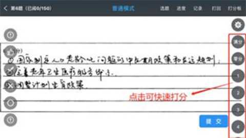 10、教师每完成一道试题的批阅后,需点击“提交”,再进入下一题。也可在设置中,将“自动提交”模式开启(注:此种方式只在普通打分模式下才能开启),开启后,点击分数后,则视为自动提交并跳转至下一题进行批阅。