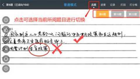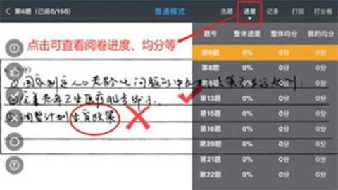 4、进入阅卷界面后,教师可在屏幕左边工具栏选择模拟的“√””ד”?“在学生试卷上进行留痕批阅。长按以上标记3秒以上可以操作删除这些批阅痕迹。