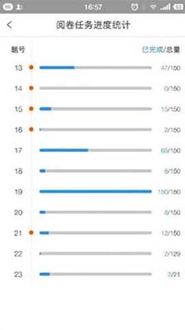 2、如果需要查看阅卷进度,点击总体进度右边的图标可以查看详细进度数据,橙色圆点表示当前用户参与阅卷的试题。