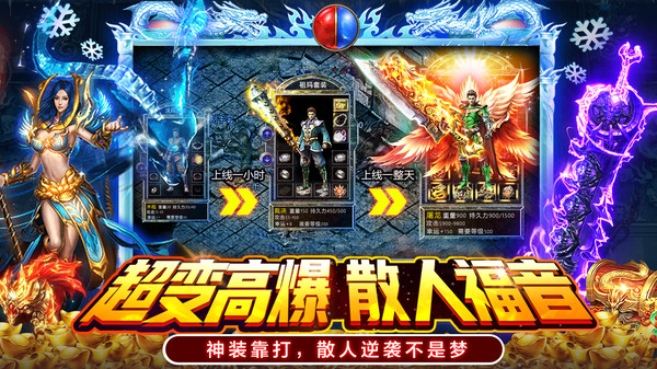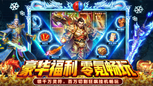 1、上线直接升满级领千万灵符和豪华礼包,小怪爆顶级红装,光柱闪满屏。