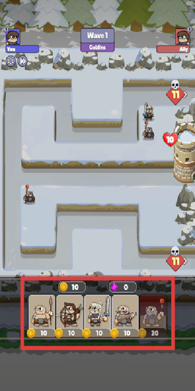 2、在对战界面下方查看可召唤的士兵类型及其消耗数值,根据当前金币数量选择合适的单位进行购买。