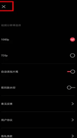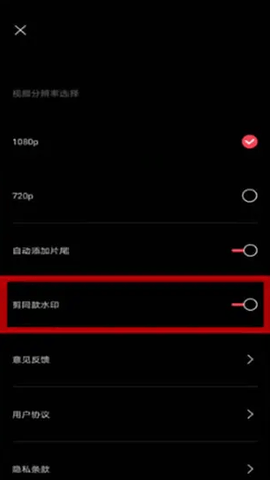 2、然后在设置的页面中我们可以使用的到的一些功能有自动添加片尾、剪同款水印、意见反馈等功能,在这里我们点击关闭【剪同款水印】后面的按钮;