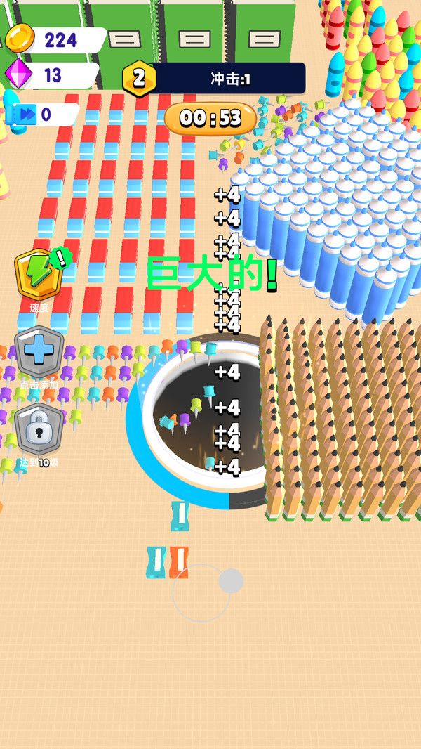 3、利用通关获得的金币,强化黑洞的吞噬能力等属性,提升后续关卡的闯关效率。