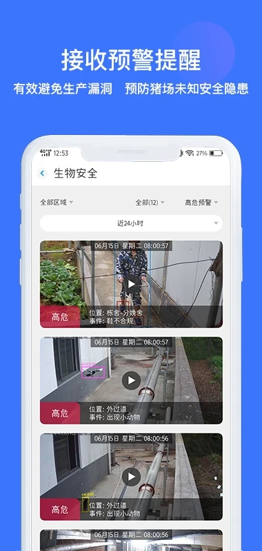 接收预警提醒,查看危险事件的监控视频,预防猪场未知安全隐患;