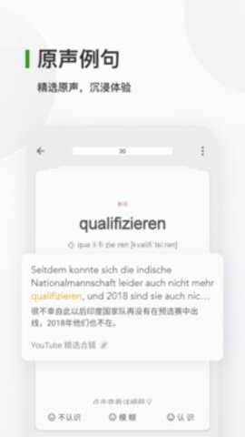 4. 音频发音支持:德语背单词每个单词都提供了真人发音,用户可以通过听力训练来提高自己的语音和听力能力。