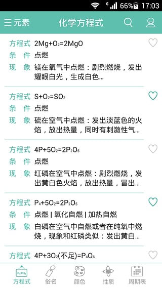 “化学方程式”软件包含方程式、俗称、颜色、性质与周期表五大模块。每一模块紧密结合、相辅相成,可以很好的帮助同学们更全面学习与认知。
