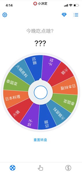 1、用户进入小决定大转盘软件后,可直接旋转转盘做出决策,点击左下角按钮,还能自定义转盘内容。