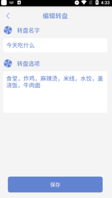 3、用户只需输入转盘主题与具体选项,完成编辑后保存,即可使用自定义转盘。