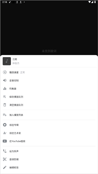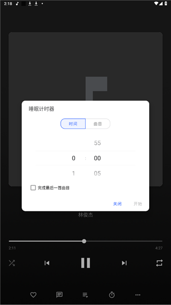 2、进入播放详情界面,可以设置定时播放,搜索歌词等功能