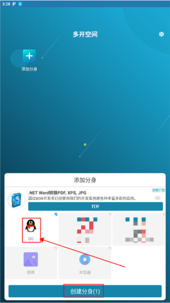 2、在弹框中选择要添加的应用,点击“创建分身”;