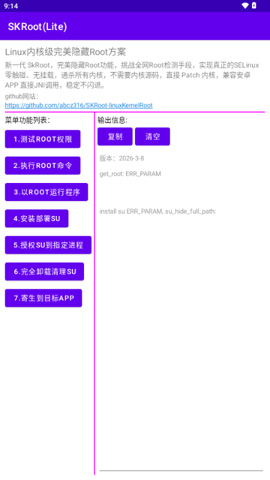 SKRoot是一款功能强大的手机ROOT工具,软件主要面向开发者、极客用户和高级玩家,提供Root权限管理、系统组件控制、性能调优等功能,相比普通优化工具,平台更强调底层权限控制,适合对手机/平板有深度定制需求的用户,采用了接近系统原生级别的隐蔽方式。