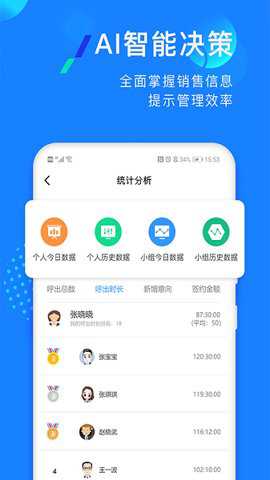 1、在企蜂云中员工可以随时随地查看排行榜、个人及小组的今日及历史数据分析,全面了解企业的经营状况。