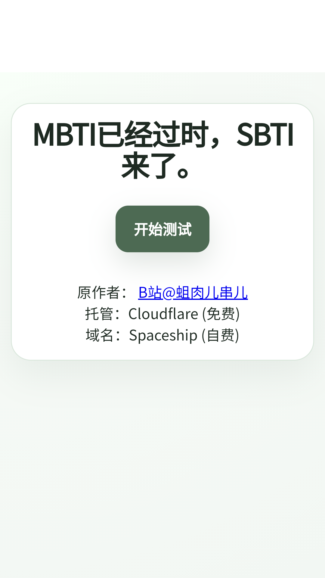sbti人格测试是一款由up主蛆肉儿串儿打造的人格测试娱乐软件,在这里用户可以根据自己的直觉进行答题,一共31道题,可以重复测试出不同的人格类型,界面简洁免费无广告,对软件感兴趣的话不妨点击下载试试!