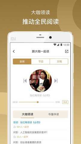 3、总裁读书会还提供年度书单和大咖领读模式,用户可以在线播放导读音频,与大咖一起阅读学习,交流分享心得经验,参与话题讨论,共同成长。