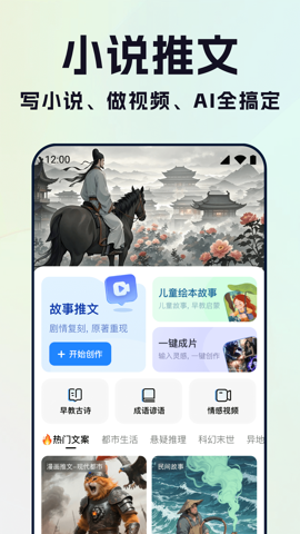 3、聚合了小说推文、儿童绘本、一键成片等多样化功能,用户可以免费使用这些功能,提高创作效率。