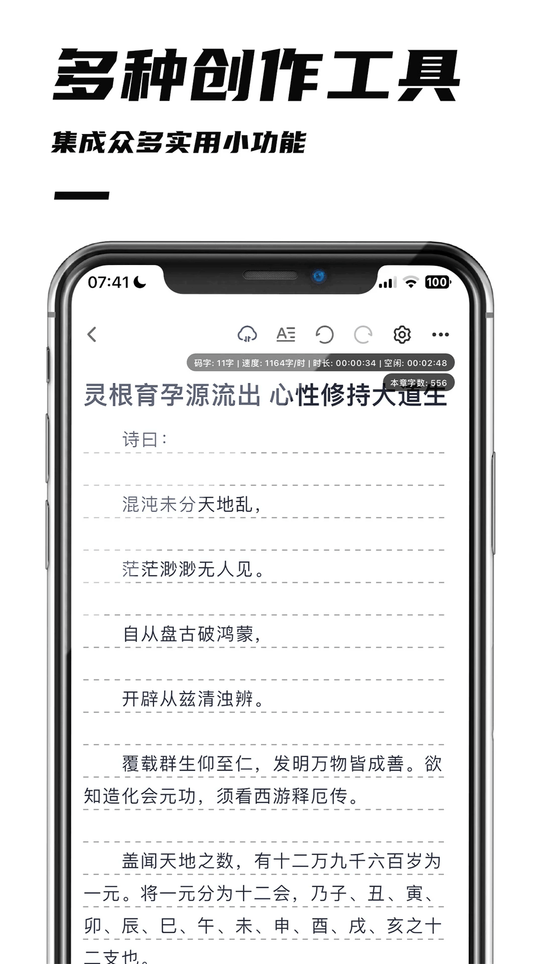 包含拼字比赛、随机取名、码字速度计算、数据统计、一键排版、敏感词检测、历史备份、离线创作、搜索查找替换、长图分享等创作辅助功能。
