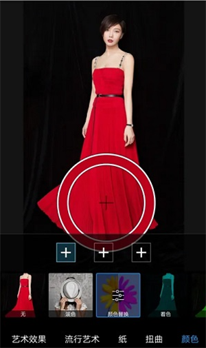 3、长按界面中间区域,会出现一个加号图标,将加号滑动至需要更换颜色的衣服位置后松开。