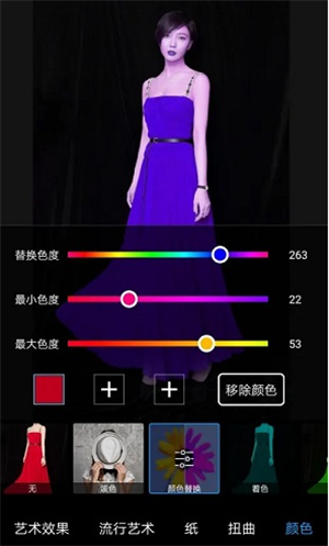 2、进入图片编辑界面后,点击“特效”选项,滑动页面至颜色相关板块,选择“替换颜色”功能。