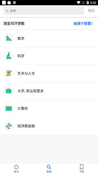 2、进入探索界面,可选择数学、科学、艺术与人文、计算机等具体学习科目,按需选择即可。