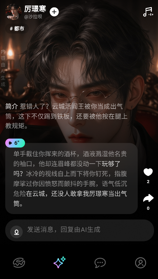 角色选择:首页上下滑动快速切换AI角色,点击进入即可聊天。