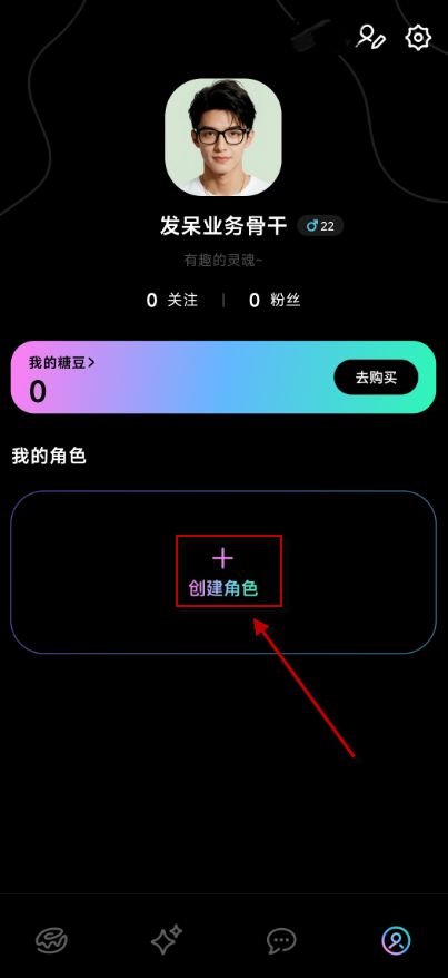 1、打开甜甜圈app,点击底部【我的】,再点击【创建角色】;