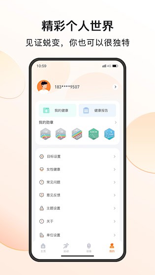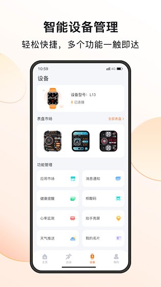 5、 设备管理:一键配对多类穿戴设备,自定义表盘样式,远程查找丢失设备,管理更灵活。